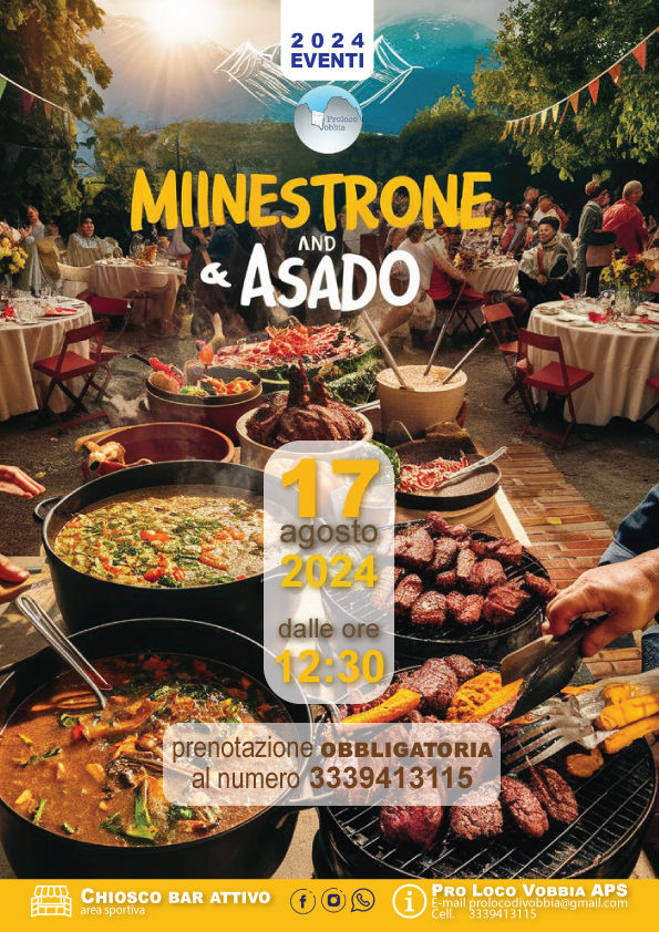 Minestrone & Asadocomunicazioneprolo029 lug 2024Tempo di lettura: 1 minSabato 17 agosto 2024 - dalle ore 12:30 Minestrone e Asado - prenotazione obbligatoria al n. 3339413115 - servizio bar attivo